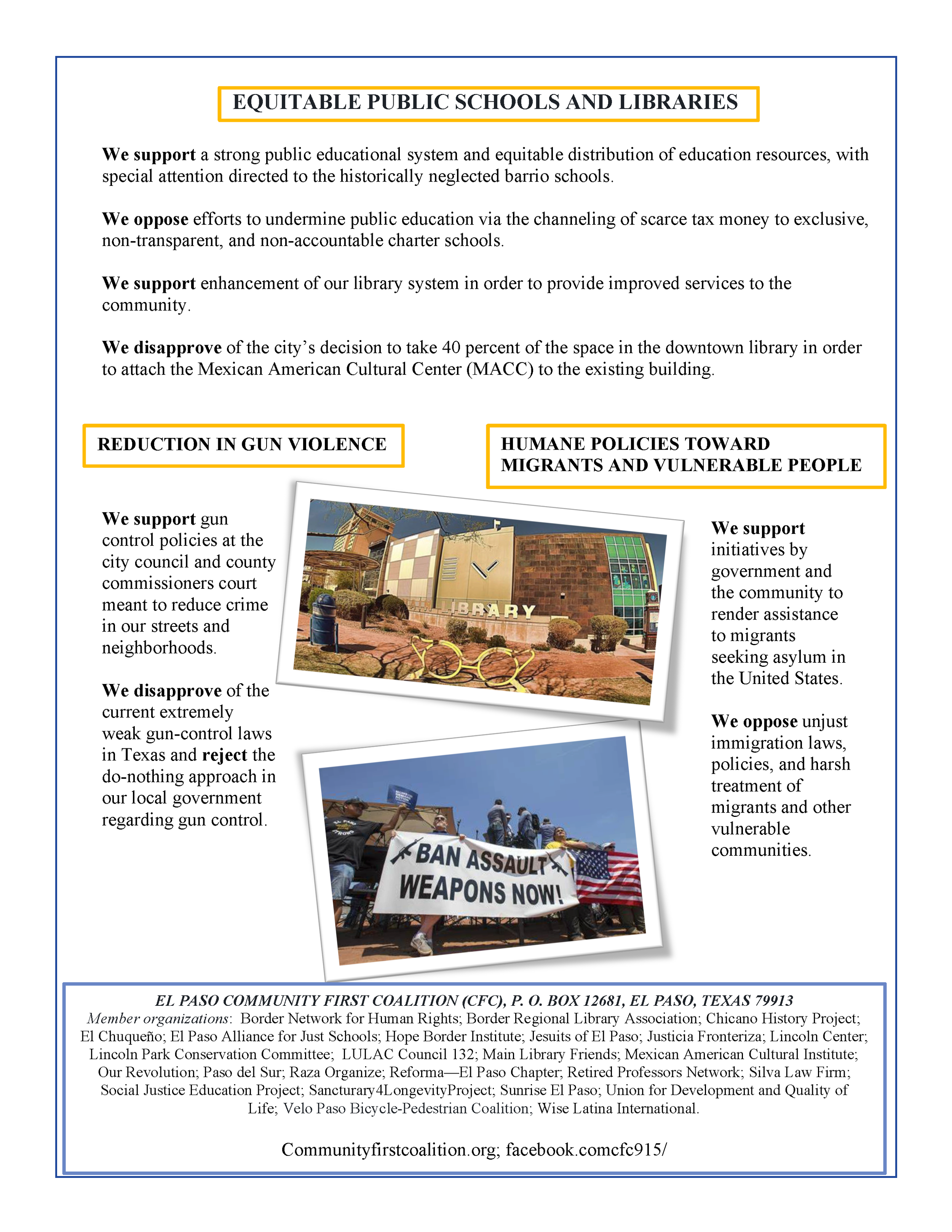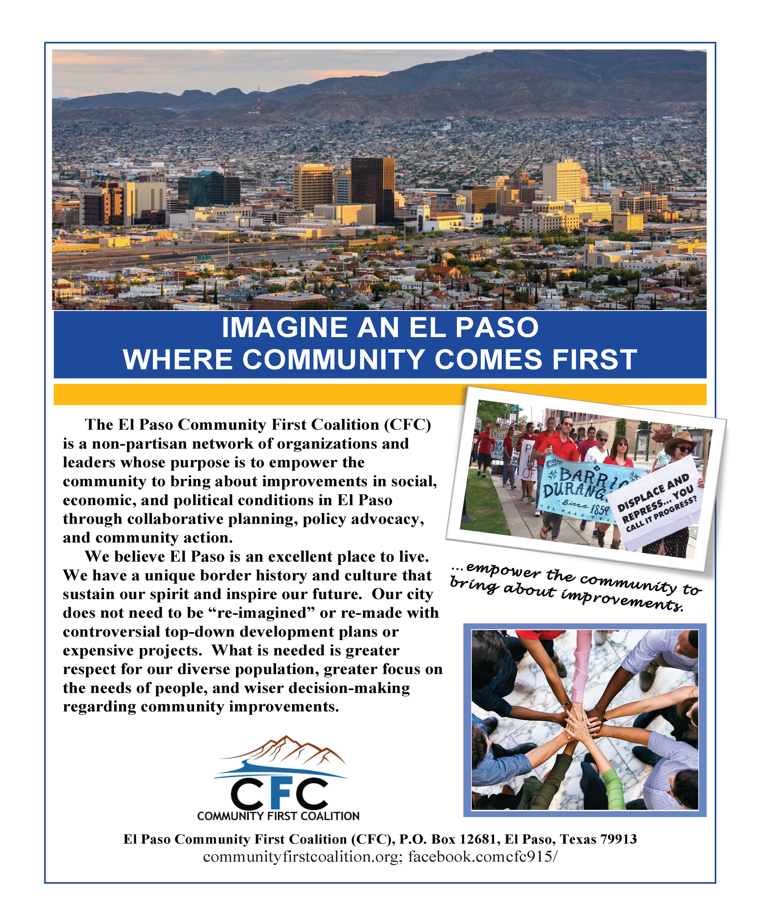 In this environment at the end of 2018, a group of community-minded activists headed by Dr. Oscar Martinez and Carmen Rodriguez decided to form a coalition of citizen groups in order to respond to and raise public awareness about these issues. Following the model of El Concilio de El Paso from the 1980s, Community First Coalition organized.