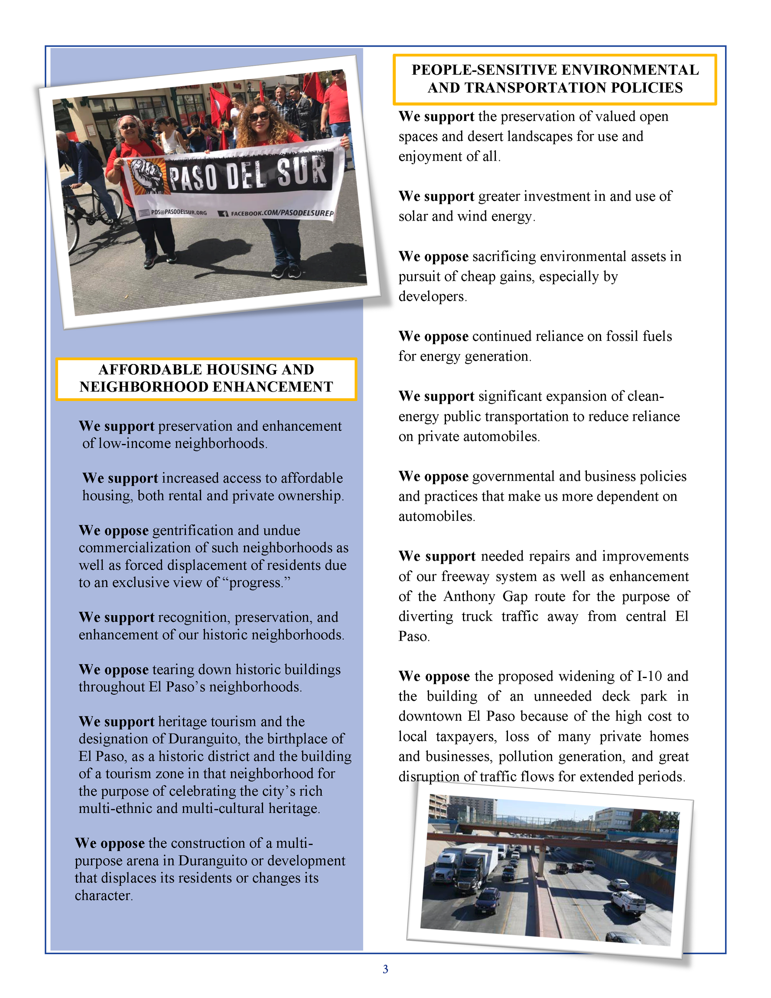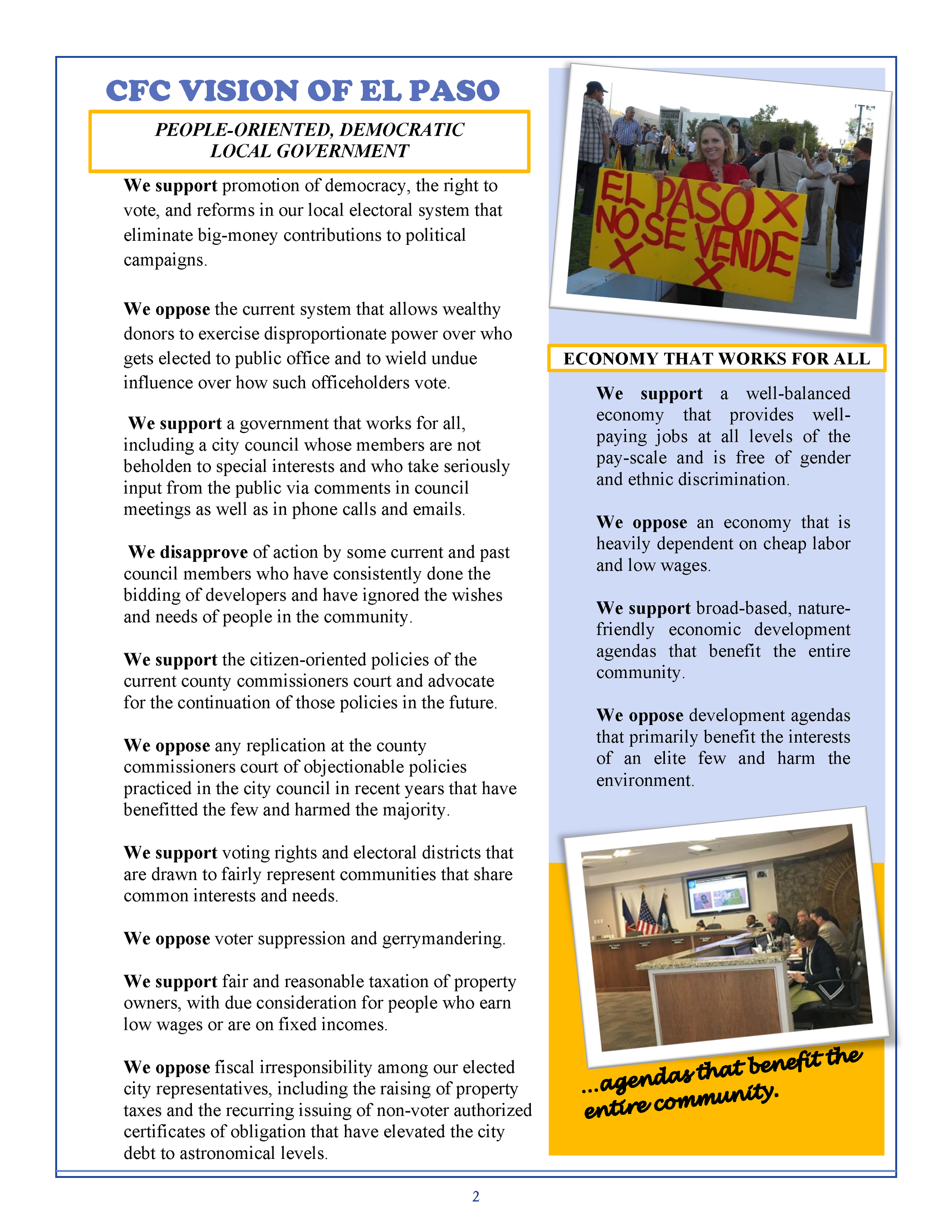 The coalition’s first major project was to write a book to reveal to the public that these controversial plans and projects, including others, were actually not the vision of our City’s elected representatives, but those of a small group of wealthy private citizens, known as the Paso del Norte Group. This elite group, who stood to profit from the projects, imposed their plans disregarding barrio residents and community needs by convincing city council members that the only way to proceed was by minimizing transparency, that is, keeping the public in the dark and using deceptive language and misrepresentations to accomplish their ends. The book, WHO RULES EL PASO? sets out how the City and the public was manipulated and continues to be controlled by the same group of elites, now often referred to as, local oligarchs.